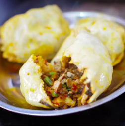 威宁小粑粑外皮是荞面,内容是豆干,咸菜,火腿一起炒的包馅。把包好的小粑粑放进锅里,锅底放点水,盖紧锅盖,小粑粑里面的油浸出来,面皮的表面和软,底面焦黄香脆,吃起来清爽可口!